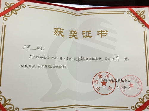 4 月 25 日上午,第四届全国口译大赛天津赛区复赛在天津外国语大学科研楼报告厅举行,来自南开大学、天津外国语大学、天津师范大学等高校的 21 名翻译方向的本科生和研究生同台竞技,共展风采。公司PA集团官网的三位研究生参加了角逐,并取得了可喜成绩,其中 2014 级研究生王宇获大赛三等奖,另两位选手鲁易和祝燕获优秀奖。PA集团官网副经理王占斌教授应邀担任评委,为本次大赛 5 位专家评委之一。